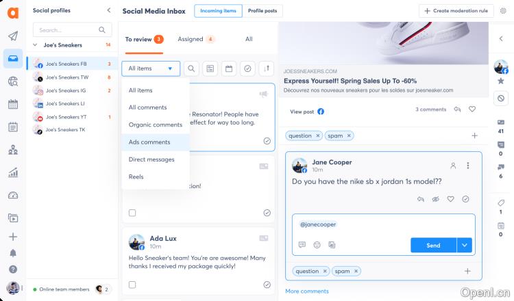 - 能够导入 Facebook 和 Instagram 广告评论,支持团队快速响应、隐藏或分配评论,对社交广告投资有重要意义。