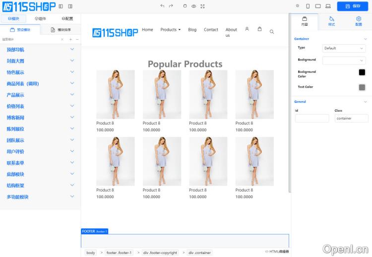 115SHOP 支持 HTML 可视化编辑器,具有超过 50 种拖拽模块,让用户能够轻松实现简单高效、高度个性化和自定义的装修。通过可视化编辑样式和支持 HTML 格式编辑,用户可以根据需要进行精细的开发,同时还提供预设的精美网页模板,方便用户快速打造独具个性的站。