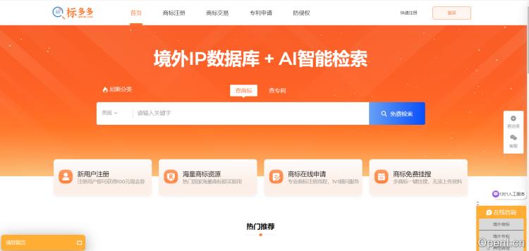 网站服务:商标注册服务,VAT,商标,海量商标资源,新用户注册福利,商标在线申请,商标免费挂搜。