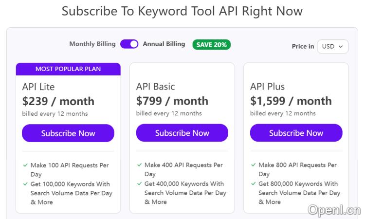 更详细的信息可以查看 Keyword Tool 官网信息 Pro 价格API价格